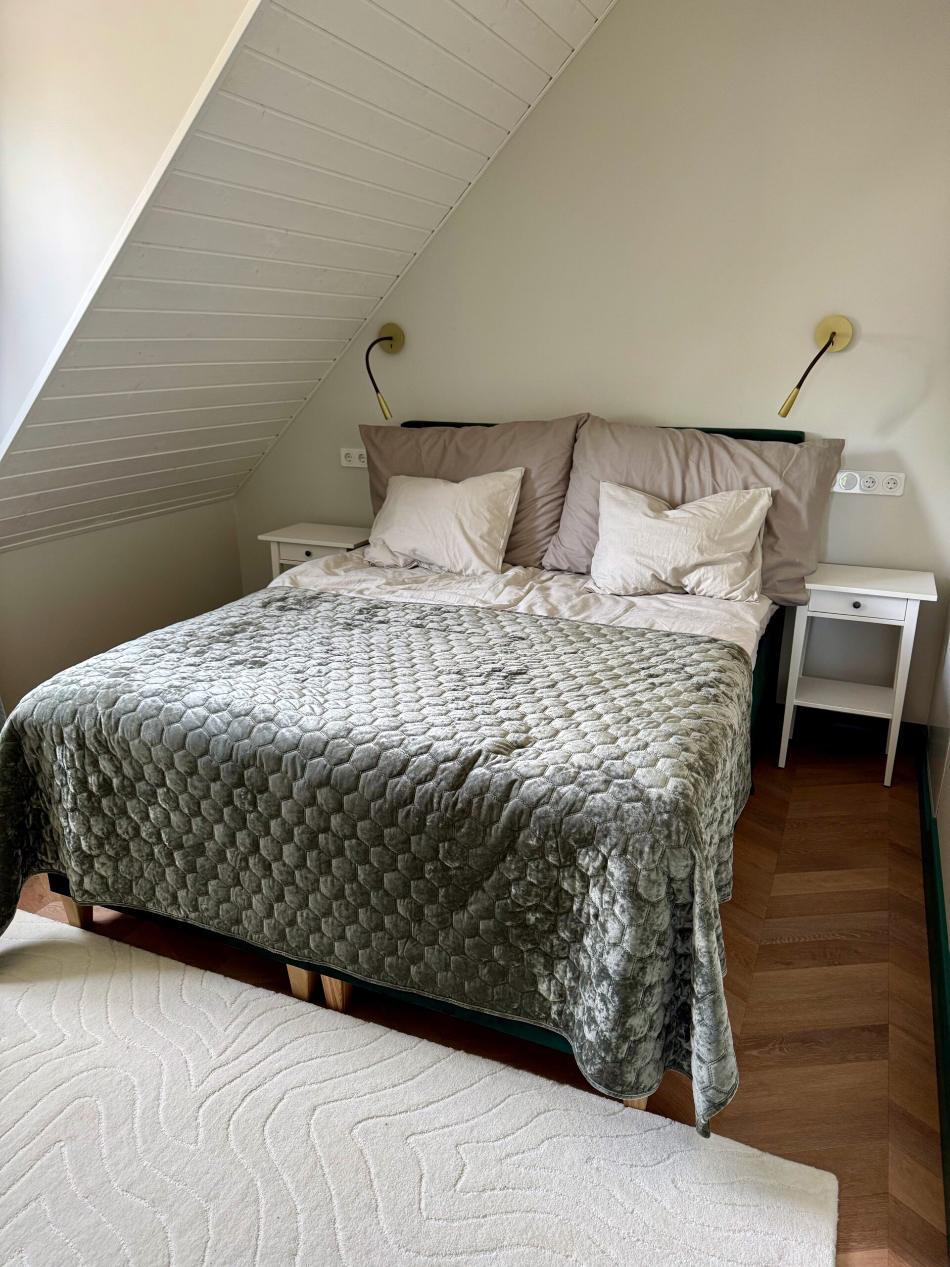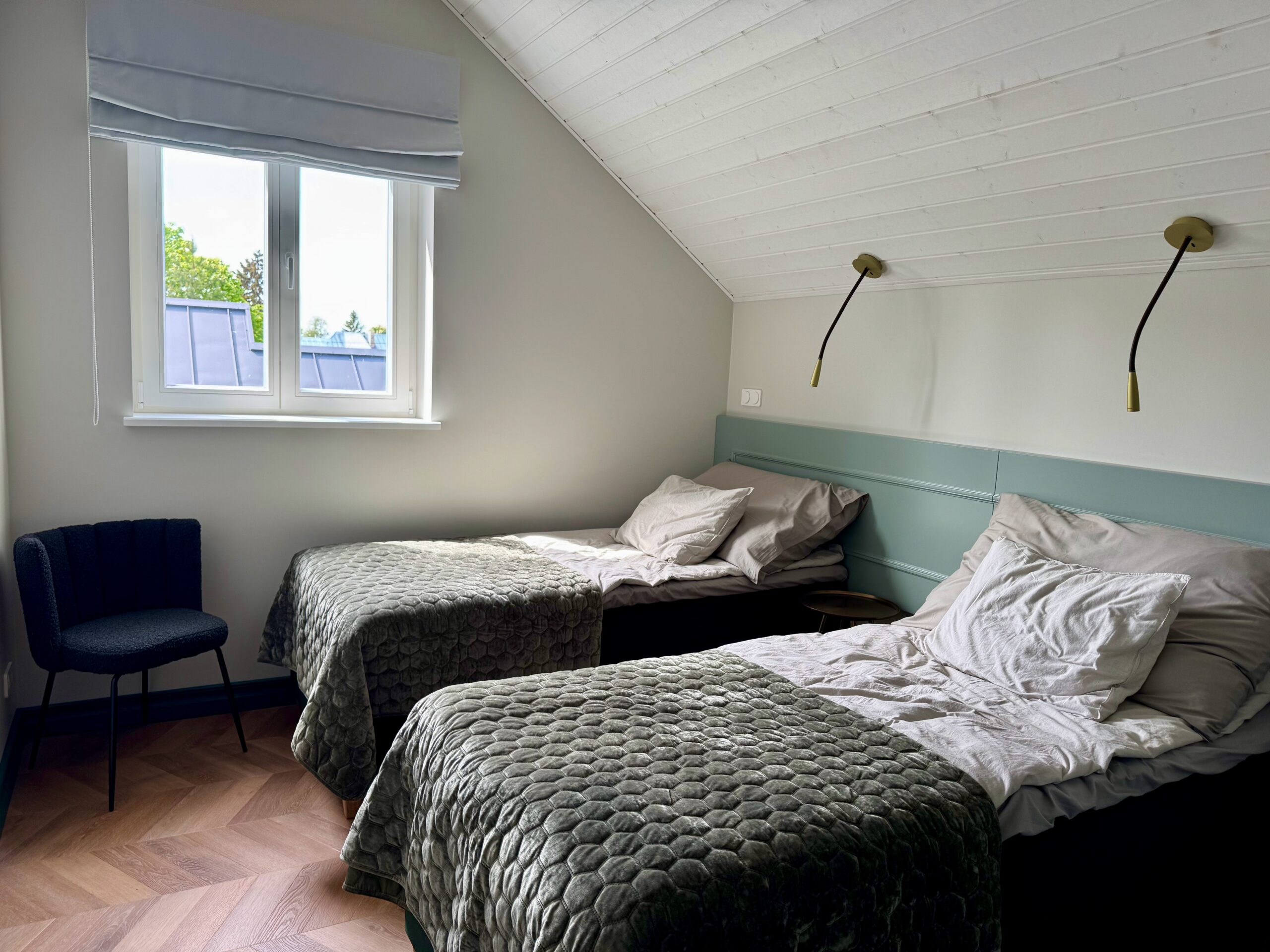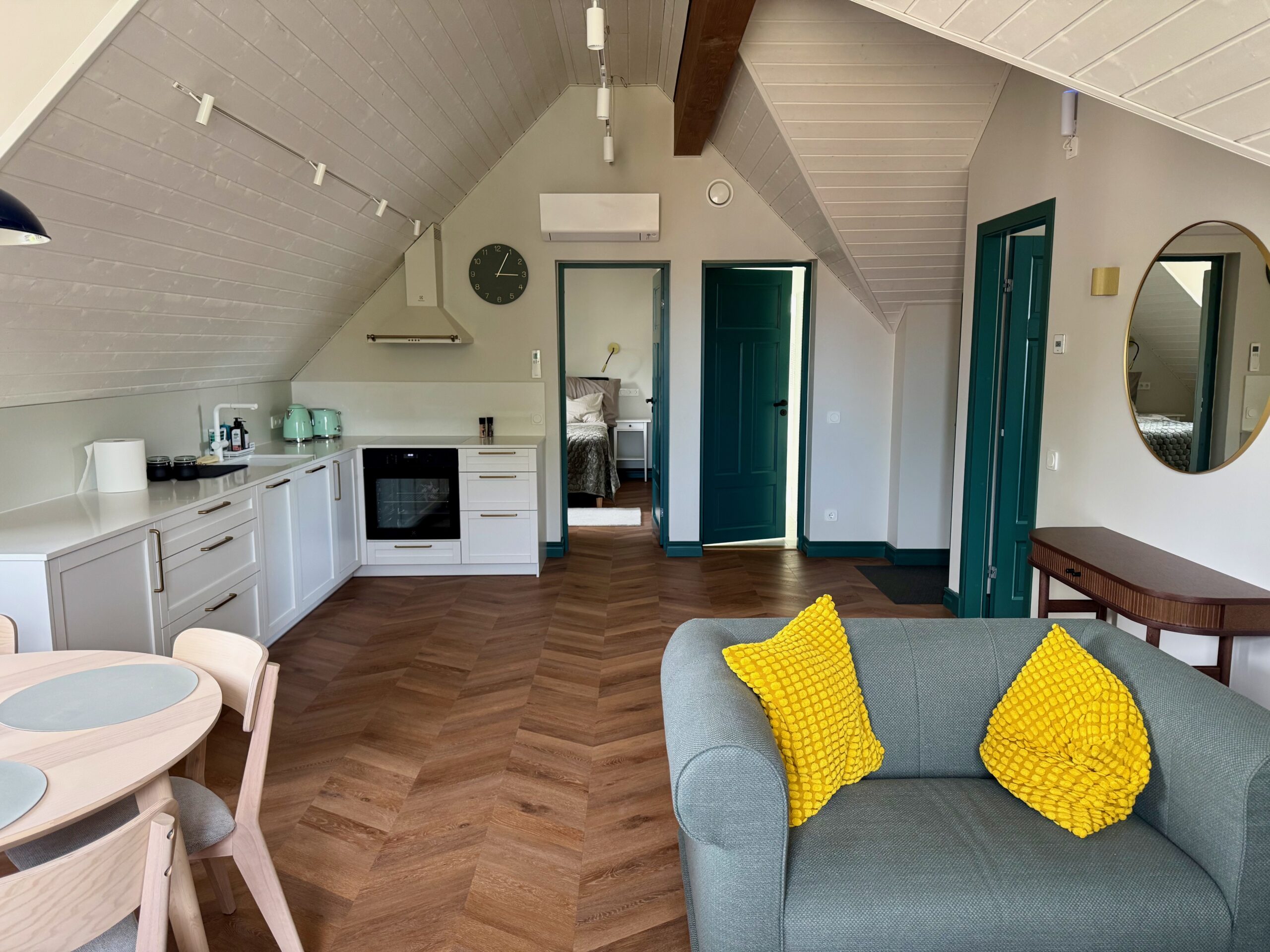 Teise korruse korteris on kaks magamistuba, millest üks on kaheinimesevoodiga ja teine kahe eraldi paikneva voodiga, avatud planeeringuga köök-elutuba ning tualett-pesuruum.